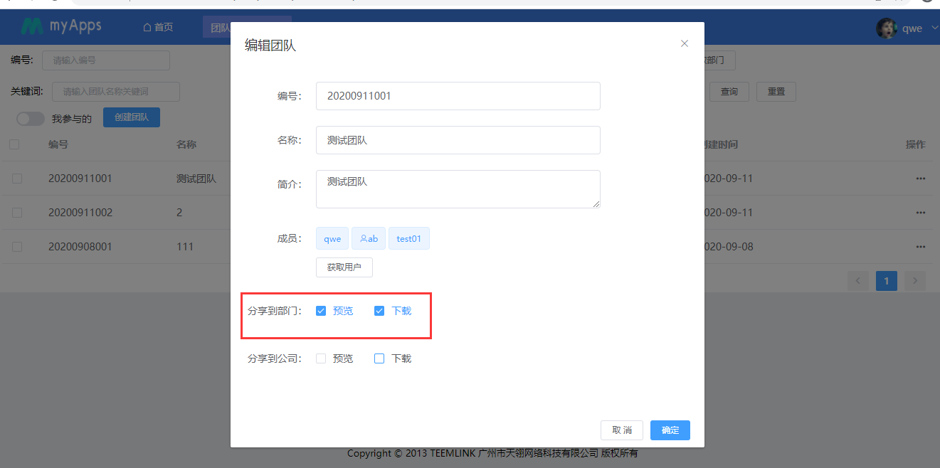 用户可创建团队(团队编号根据建立时间自动生成),选择团队成员,是否允许除团队内部人员外的用户有下载、预览等操作权限。