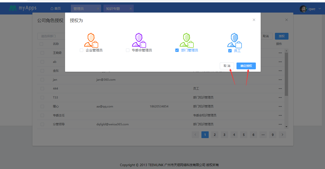 企业知识管理员可对用户进行授权